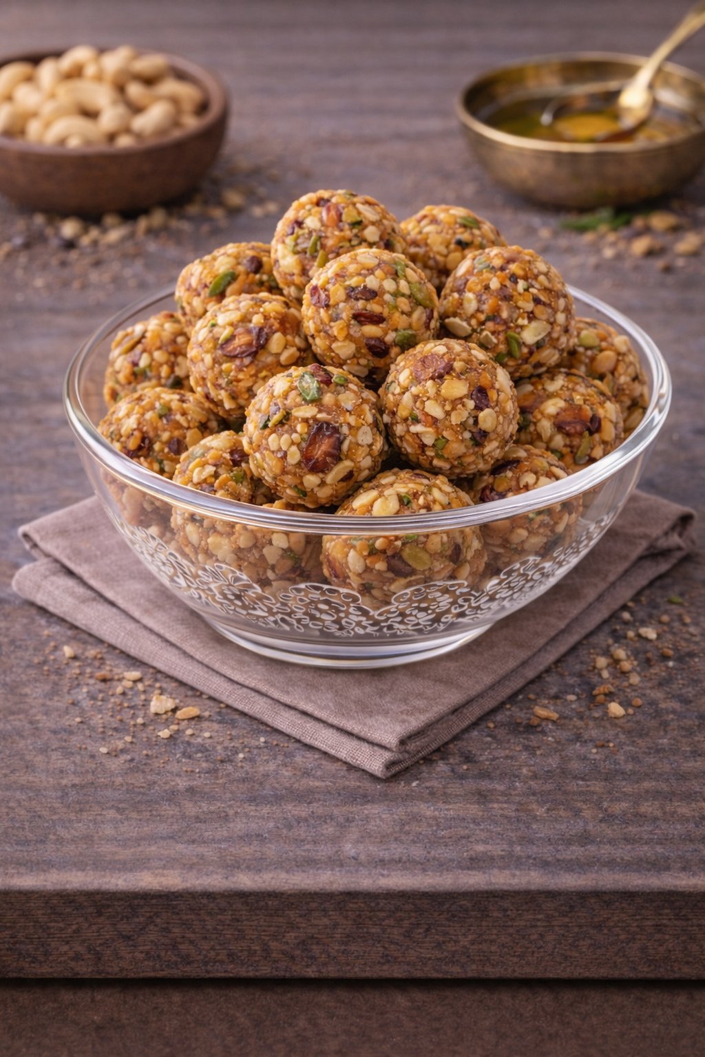 Nutritious Dry Fruit Laddu made with premium nuts, dates, and pure ghee. A wholesome energy snack perfect for healthy indulgence and festive gifting.