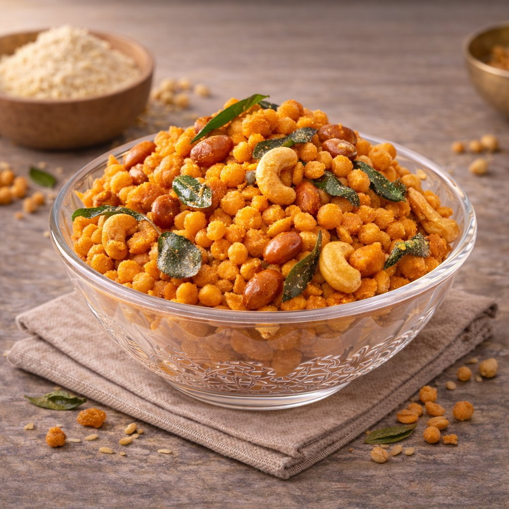 Boondi is prepared by dropping gram flour batter through a perforated ladle into hot oil, forming small golden pearls that become perfectly crispy when fried. These crispy boondi pieces are then seasoned with spices and sometimes combined with roasted nuts and curry leaves to create a flavorful snack mixture.